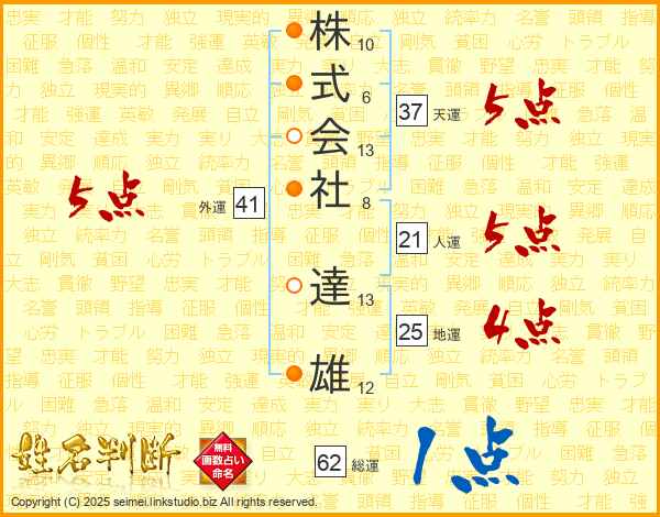 株(10画)式(6画)会(13画)社(8画) 達(13画)雄(12画)