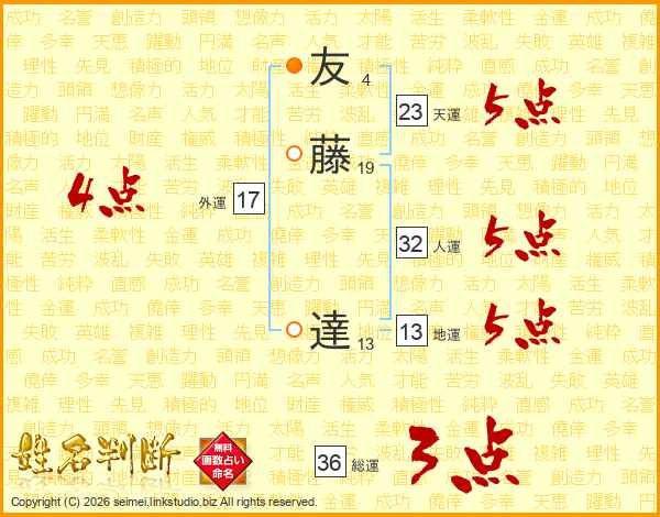 友藤達さんの総運は36画の3点!