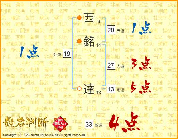 生活面を象徴する運勢です。外部から受ける影響力を表し、結婚運、家庭運や職場、環境への順応性を表します。総運から人運を引いた画数。姓や名が1文字の場合を除く。