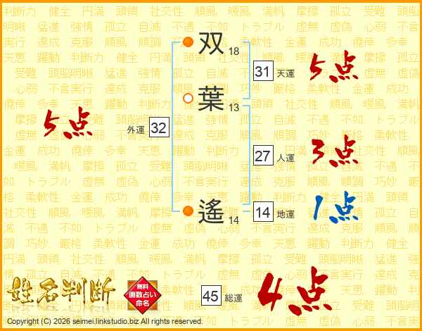生活面を象徴する運勢です。外部から受ける影響力を表し、結婚運、家庭運や職場、環境への順応性を表します。総運から人運を引いた画数。姓や名が1文字の場合を除く。