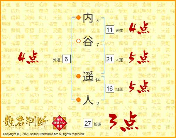 生活面を象徴する運勢です。外部から受ける影響力を表し、結婚運、家庭運や職場、環境への順応性を表します。総運から人運を引いた画数。姓や名が1文字の場合を除く。