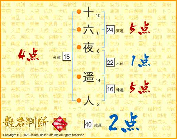 生活面を象徴する運勢です。外部から受ける影響力を表し、結婚運、家庭運や職場、環境への順応性を表します。総運から人運を引いた画数。姓や名が1文字の場合を除く。