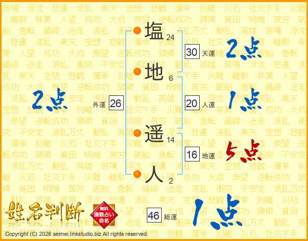 生活面を象徴する運勢です。外部から受ける影響力を表し、結婚運、家庭運や職場、環境への順応性を表します。総運から人運を引いた画数。姓や名が1文字の場合を除く。
