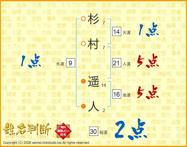 杉(7画)村(7画) 遥(14画)人(2画)