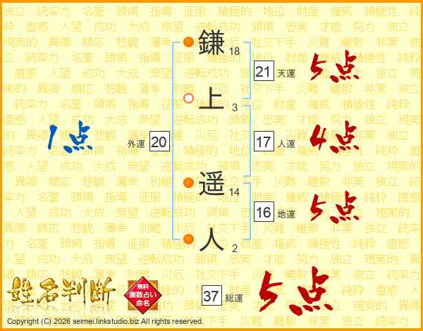 生活面を象徴する運勢です。外部から受ける影響力を表し、結婚運、家庭運や職場、環境への順応性を表します。総運から人運を引いた画数。姓や名が1文字の場合を除く。