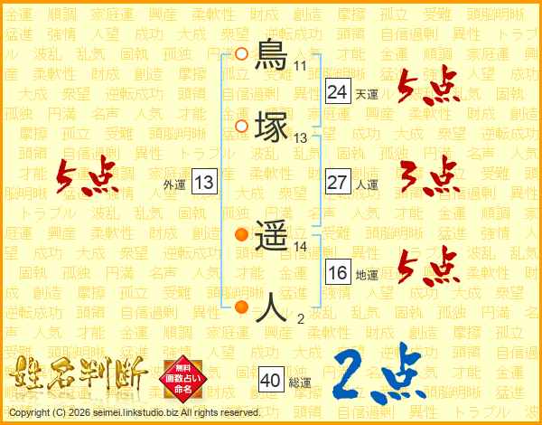 鳥塚遥人さんの総運は40画の2点!