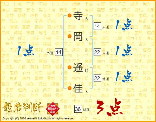 寺(6画)岡(8画) 遥(14画)佳(8画)