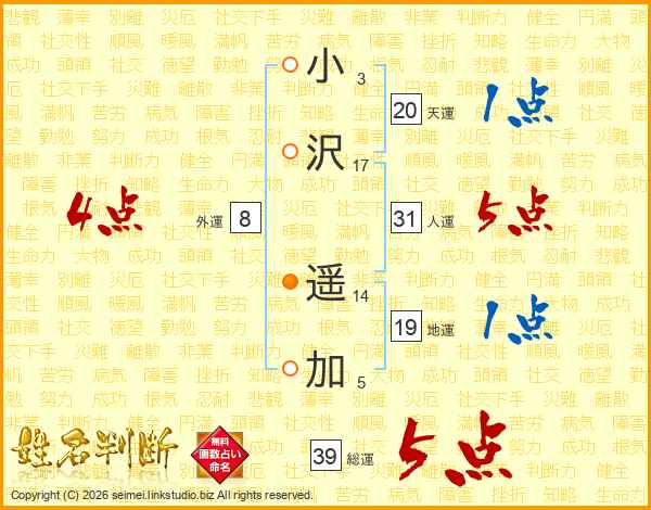 生活面を象徴する運勢です。外部から受ける影響力を表し、結婚運、家庭運や職場、環境への順応性を表します。総運から人運を引いた画数。姓や名が1文字の場合を除く。