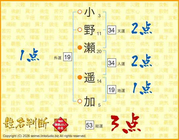 小(3画)野(11画)瀬(20画) 遥(14画)加(5画)