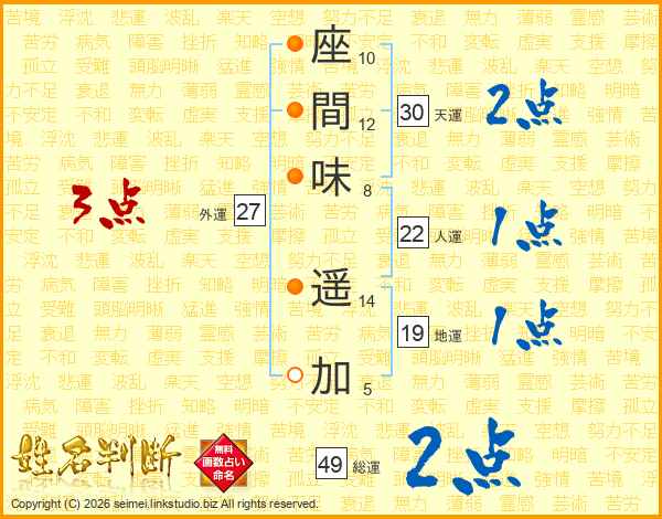 座(10画)間(12画)味(8画) 遥(14画)加(5画)