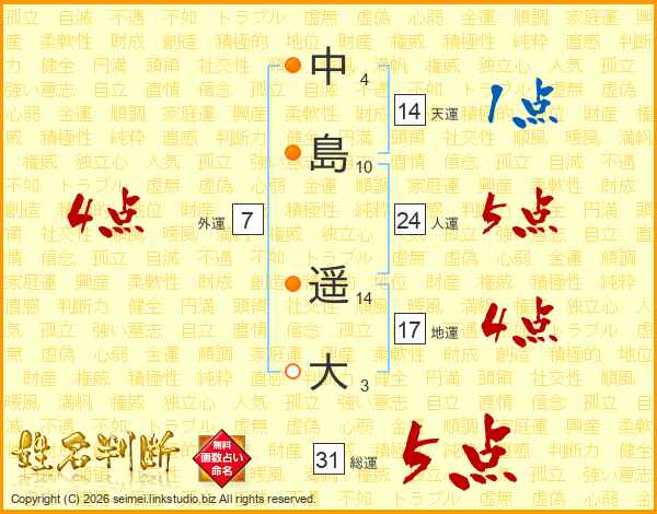 中(4画)島(10画) 遥(14画)大(3画)