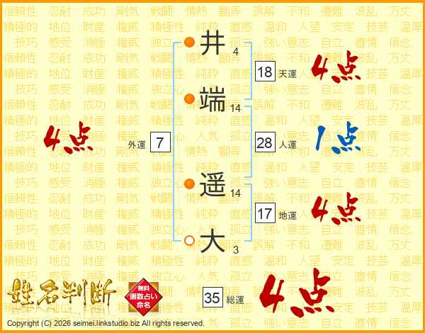 井(4画)端(14画) 遥(14画)大(3画)