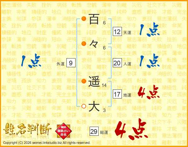 生活面を象徴する運勢です。外部から受ける影響力を表し、結婚運、家庭運や職場、環境への順応性を表します。総運から人運を引いた画数。姓や名が1文字の場合を除く。