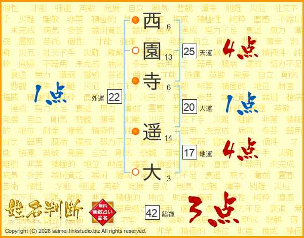西(6画)園(13画)寺(6画) 遥(14画)大(3画)