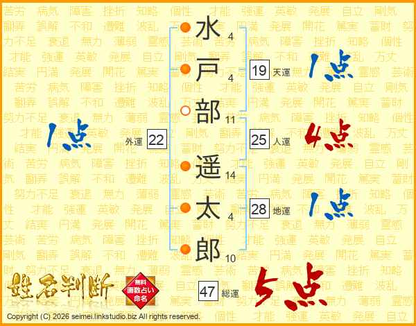 水(4画)戸(4画)部(11画) 遥(14画)太(4画)郎(10画)