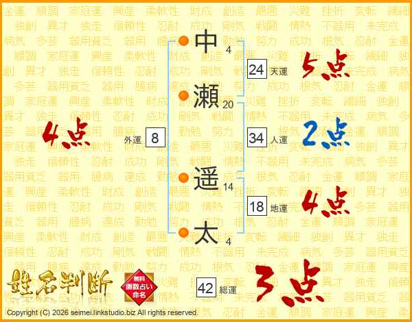中(4画)瀬(20画) 遥(14画)太(4画)