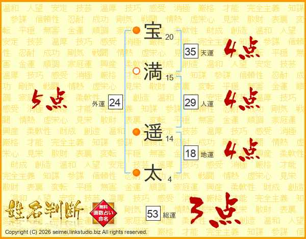 宝(20画)満(15画) 遥(14画)太(4画)