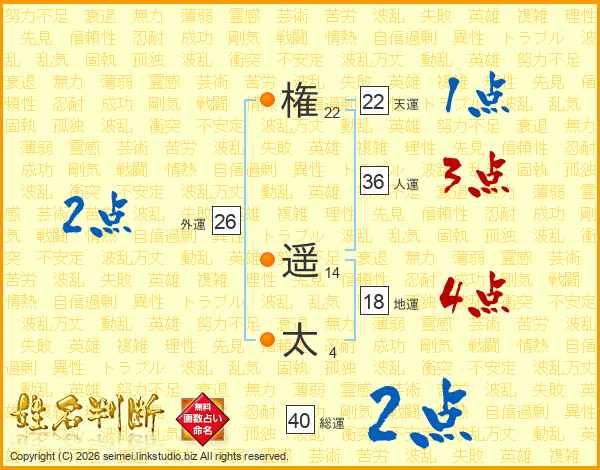 権(22画) 遥(14画)太(4画)
