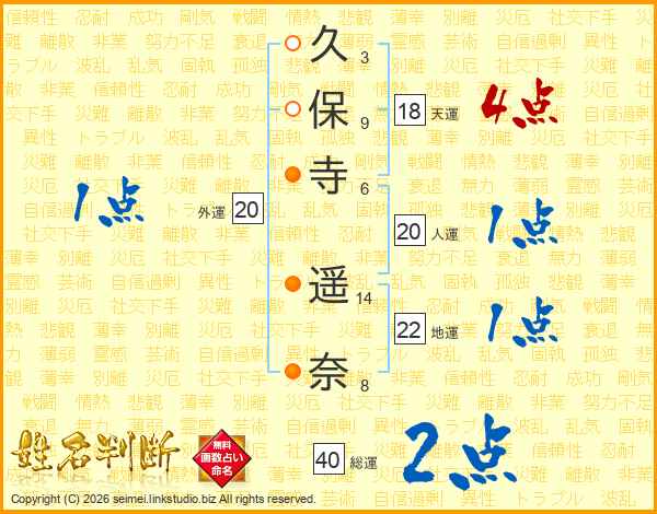 久(3画)保(9画)寺(6画) 遥(14画)奈(8画)