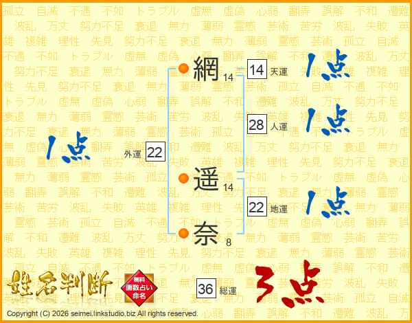 生活面を象徴する運勢です。外部から受ける影響力を表し、結婚運、家庭運や職場、環境への順応性を表します。総運から人運を引いた画数。姓や名が1文字の場合を除く。