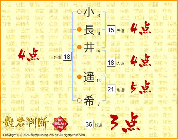 小(3画)長(8画)井(4画) 遥(14画)希(7画)