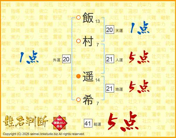 飯村遥希さんの総運は41画の5点!