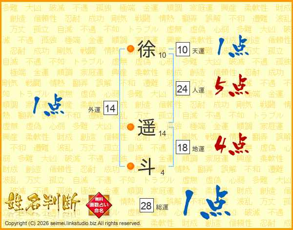 生活面を象徴する運勢です。外部から受ける影響力を表し、結婚運、家庭運や職場、環境への順応性を表します。総運から人運を引いた画数。姓や名が1文字の場合を除く。