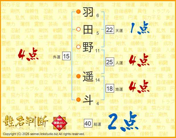 羽(6画)田(5画)野(11画) 遥(14画)斗(4画)