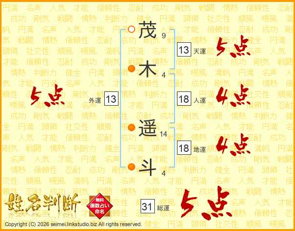 茂(9画)木(4画) 遥(14画)斗(4画)