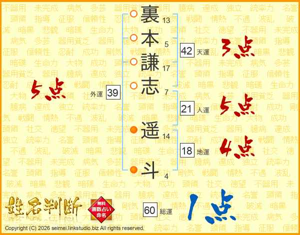 裏(13画)本(5画)謙(17画)志(7画) 遥(14画)斗(4画)