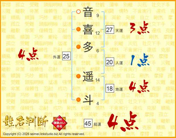 音(9画)喜(12画)多(6画) 遥(14画)斗(4画)