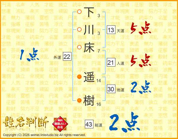 下川床遥樹さんの天運は13画の5点!