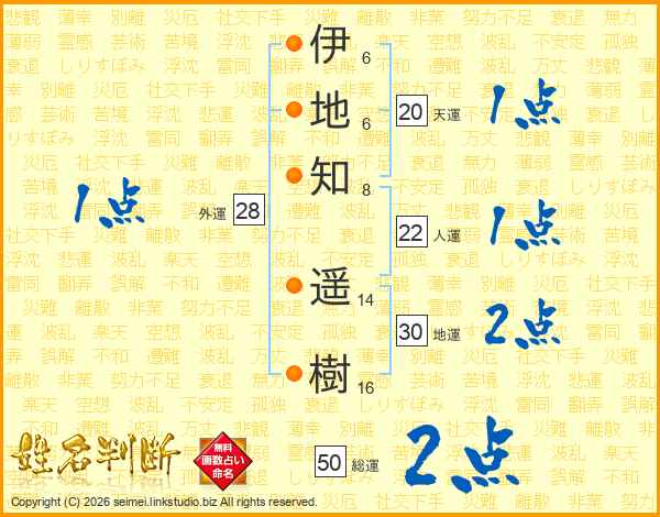 伊(6画)地(6画)知(8画) 遥(14画)樹(16画)