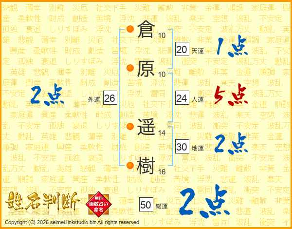 倉(10画)原(10画) 遥(14画)樹(16画)