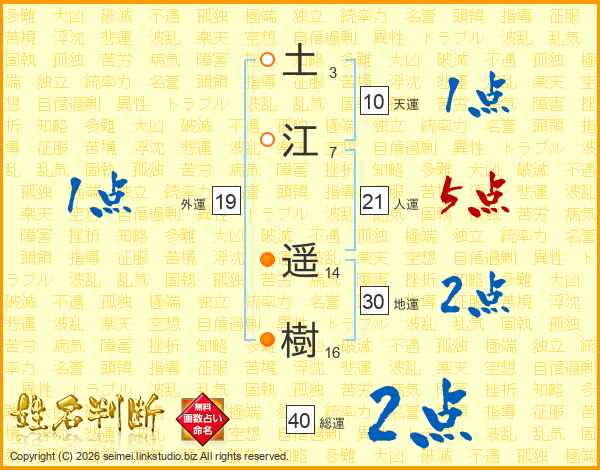生活面を象徴する運勢です。外部から受ける影響力を表し、結婚運、家庭運や職場、環境への順応性を表します。総運から人運を引いた画数。姓や名が1文字の場合を除く。