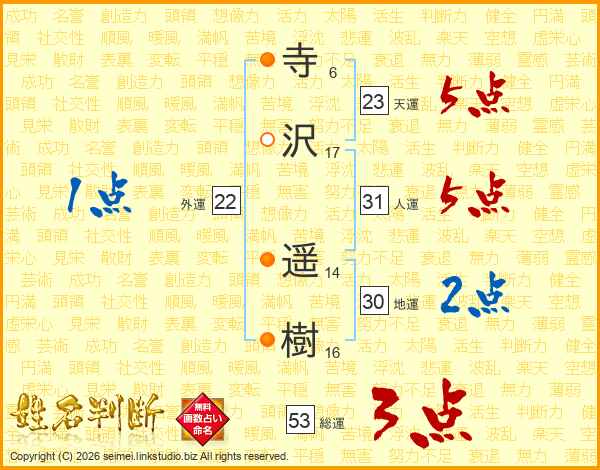 寺(6画)沢(17画) 遥(14画)樹(16画)