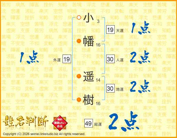 小(3画)幡(16画) 遥(14画)樹(16画)
