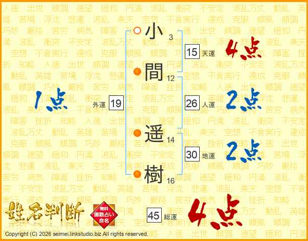 生活面を象徴する運勢です。外部から受ける影響力を表し、結婚運、家庭運や職場、環境への順応性を表します。総運から人運を引いた画数。姓や名が1文字の場合を除く。