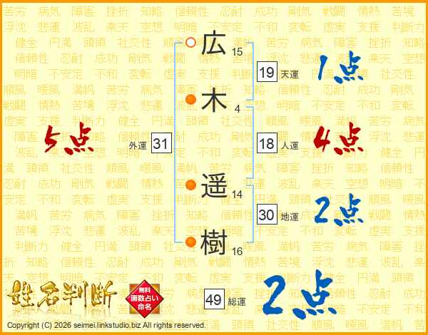 広(15画)木(4画) 遥(14画)樹(16画)