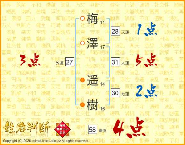 梅(11画)澤(17画) 遥(14画)樹(16画)