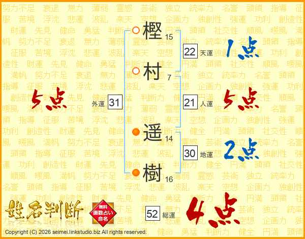 樫(15画)村(7画) 遥(14画)樹(16画)