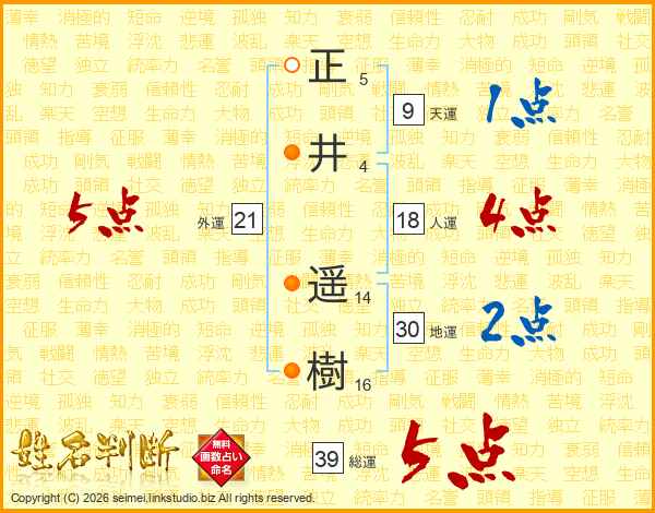 あなたの人生を表す1番重要な運勢です。生涯を通じて影響する総合運となり、主に50歳以降の晩年期に影響を及ぼします。苗字と名前の合計画数。