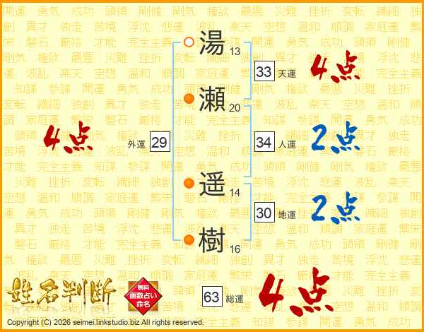 湯瀬遥樹さんの天運は33画の4点!