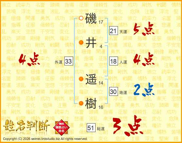 磯(17画)井(4画) 遥(14画)樹(16画)