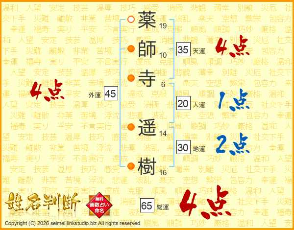 薬(19画)師(10画)寺(6画) 遥(14画)樹(16画)