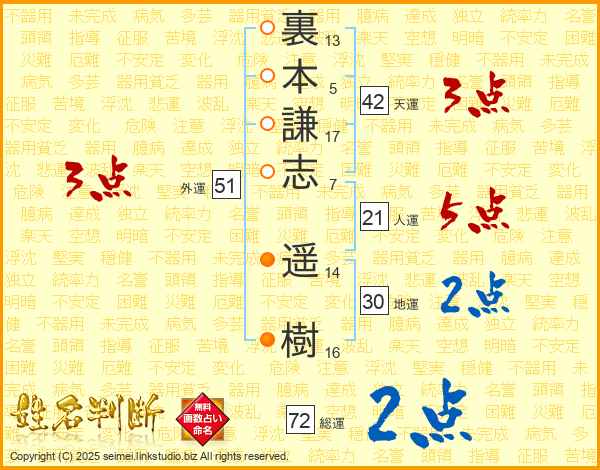 裏(13画)本(5画)謙(17画)志(7画) 遥(14画)樹(16画)