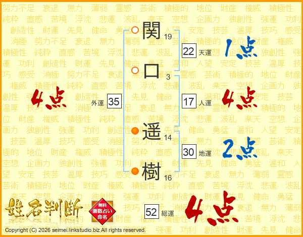関(19画)口(3画) 遥(14画)樹(16画)