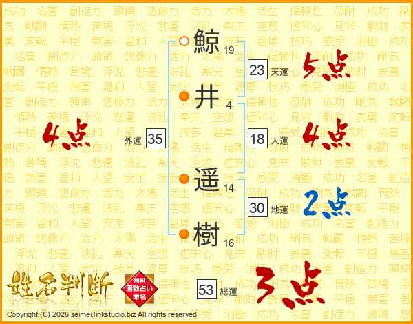 鯨(19画)井(4画) 遥(14画)樹(16画)