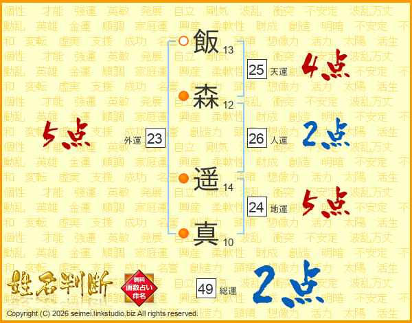 あなたの人生を表す1番重要な運勢です。生涯を通じて影響する総合運となり、主に50歳以降の晩年期に影響を及ぼします。苗字と名前の合計画数。