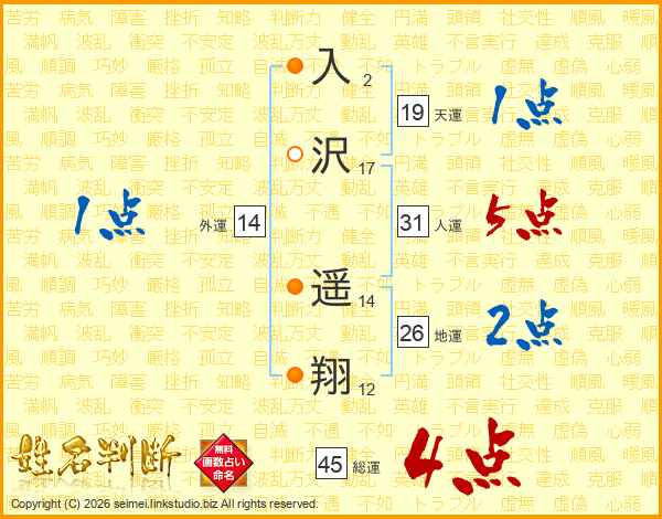 入(2画)沢(17画) 遥(14画)翔(12画)